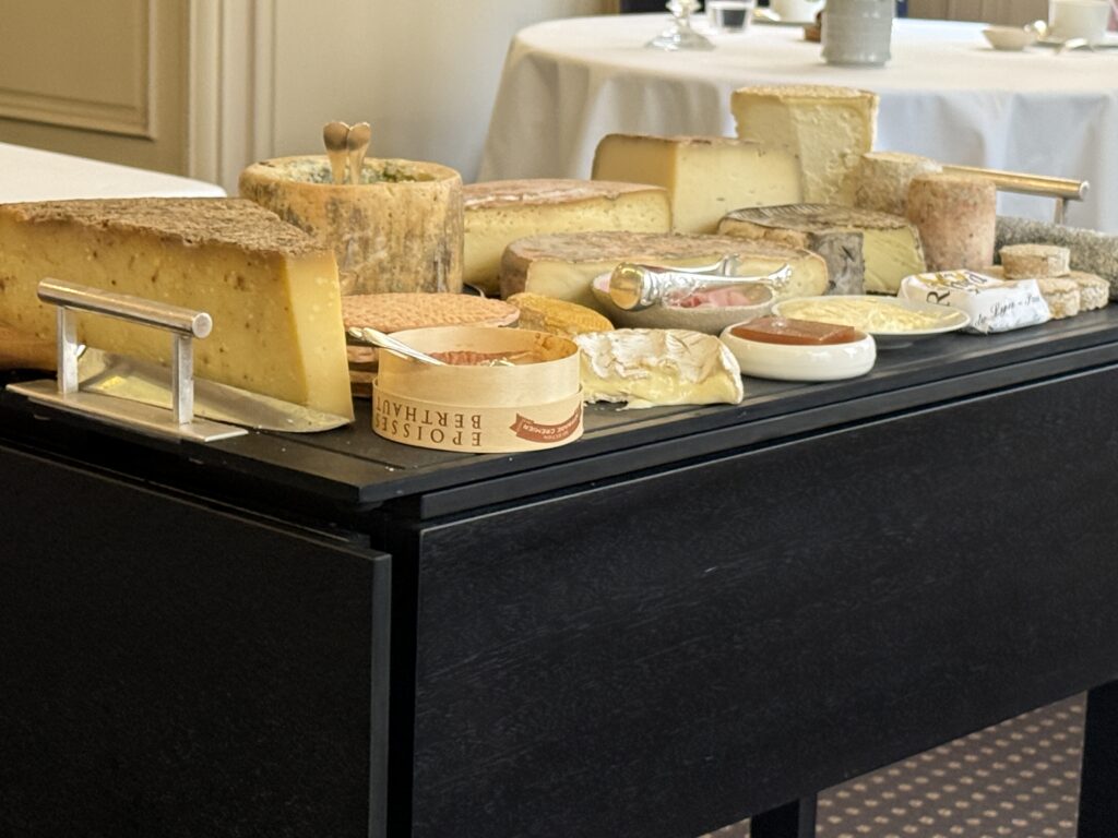 – Raw cow’s milk tome, black cherry jam – 64% dark chocolate mousse, salted butter caramel, cocoa nibs, crunchy peanuts – Floating isles, vanilla custard, raspberry coulis, strawberries