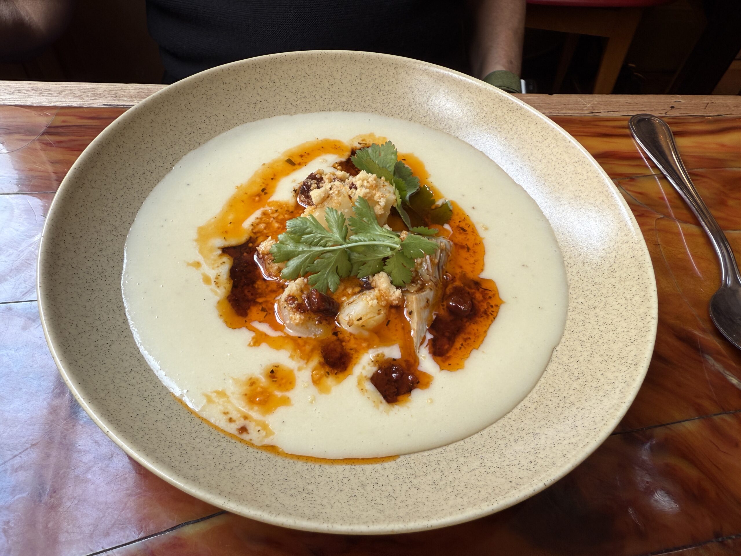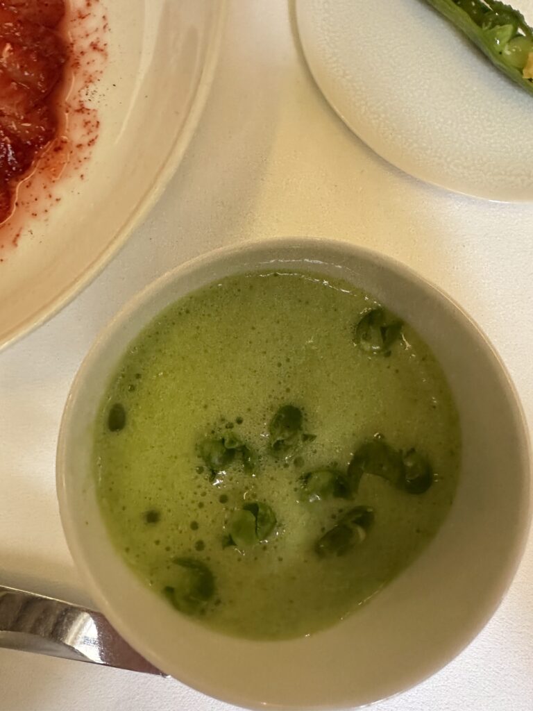 – Salmon Gravlàx then house smoked, garden radishes, avocado cream, radish top coulis, Granny Smith apples – Calf’s head cooked in broth, served sliced like carpaccio, anchovy ravigote sauce, délicatesse new potatoes 1 – Artichoke heart veloute, candied purple artichokes, white asparagus, chorizo vinaigrette, Parmesan crumble