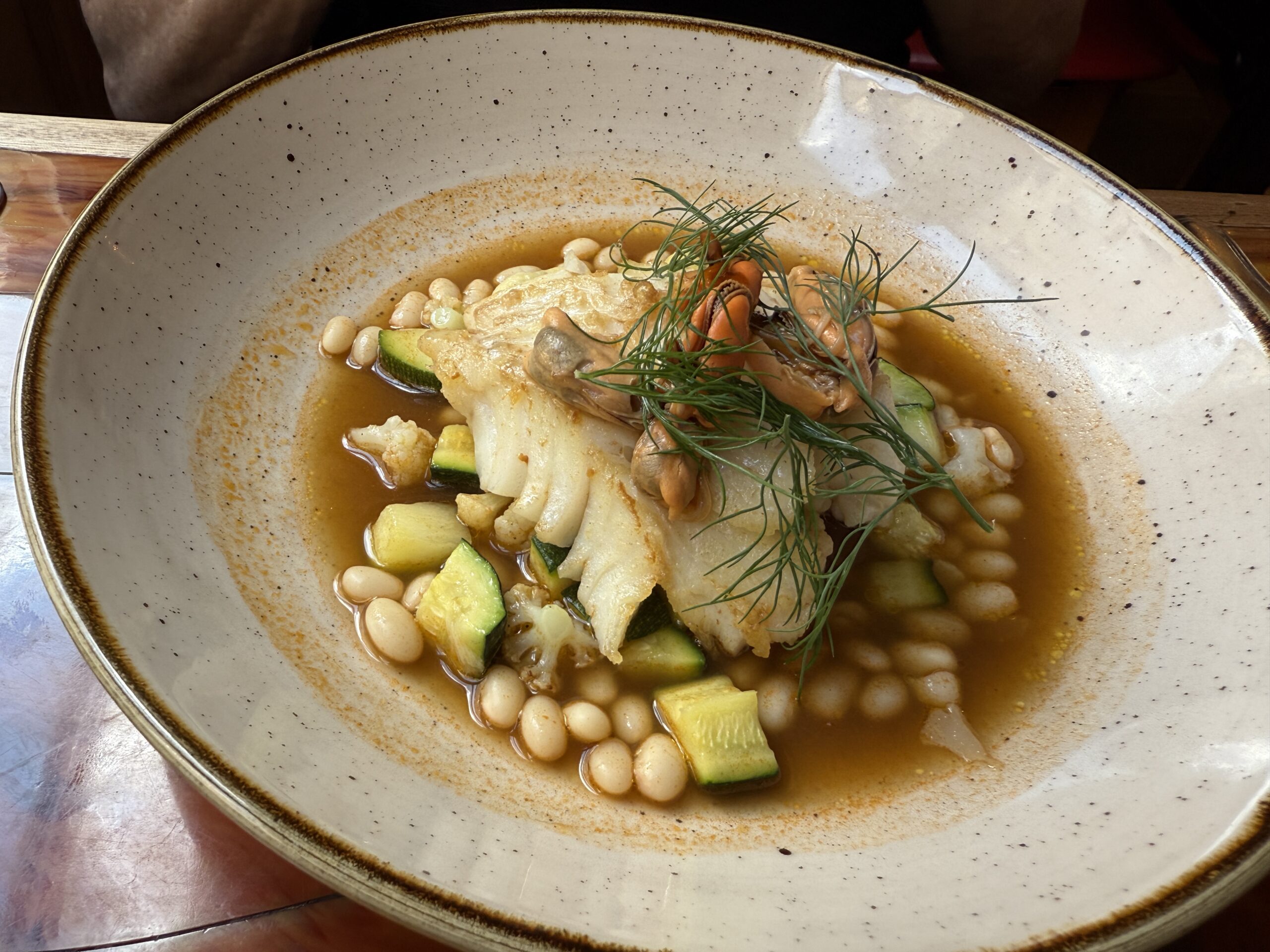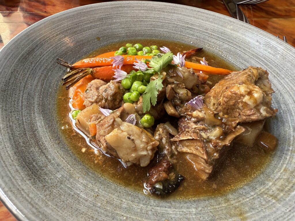 2 – Cod filet, rope mussels, shrimp bisque, white beans, zucchini, cauliflower – Basque pork loin in panko breadcrumbs, chimichurri sauce; potato puree, round turnips, red cabbage 3 – Veal shoulder confit with lemongrass, reduced cooking juices; red carrot purée with cumin, carrot tops, peas