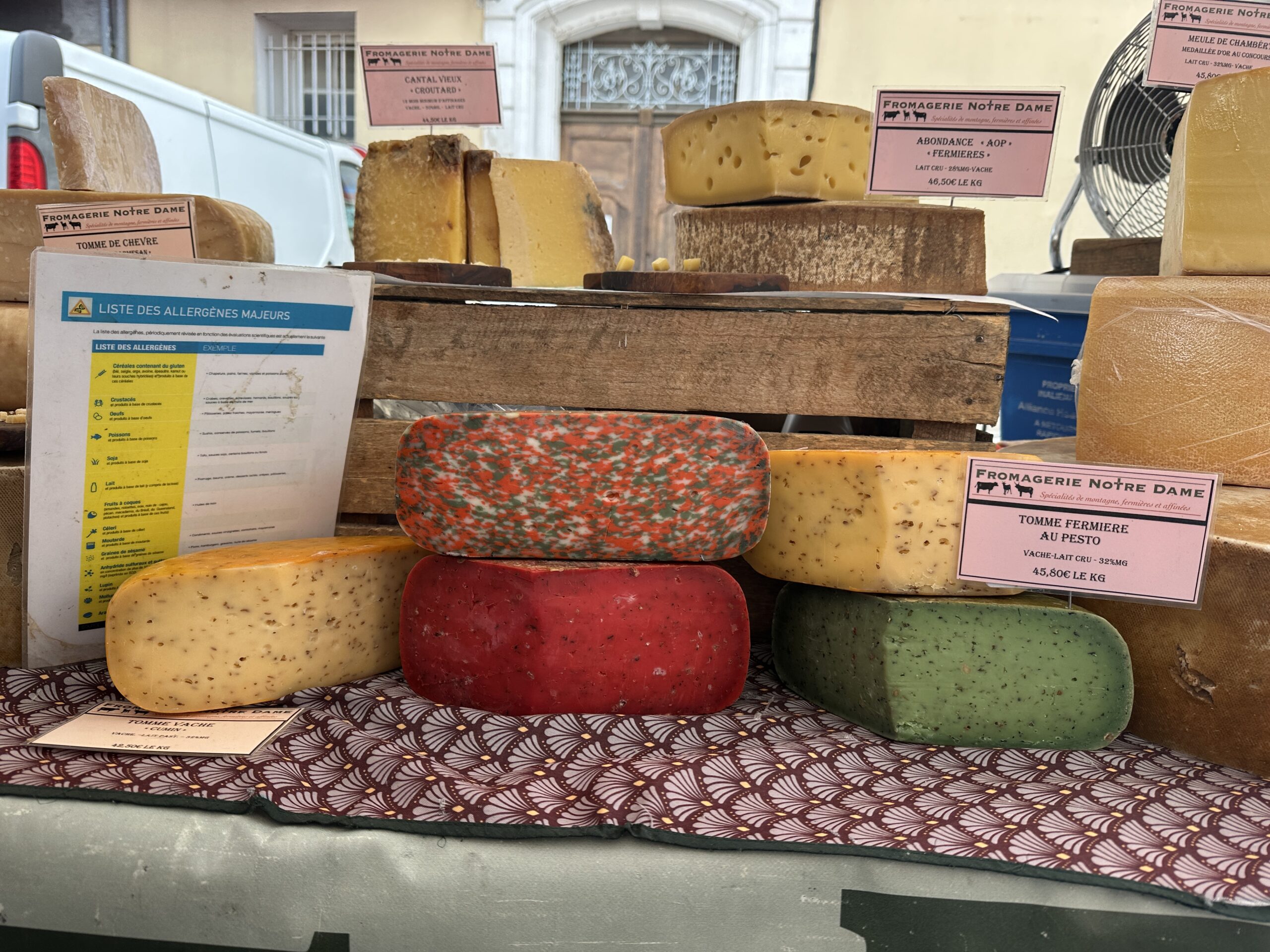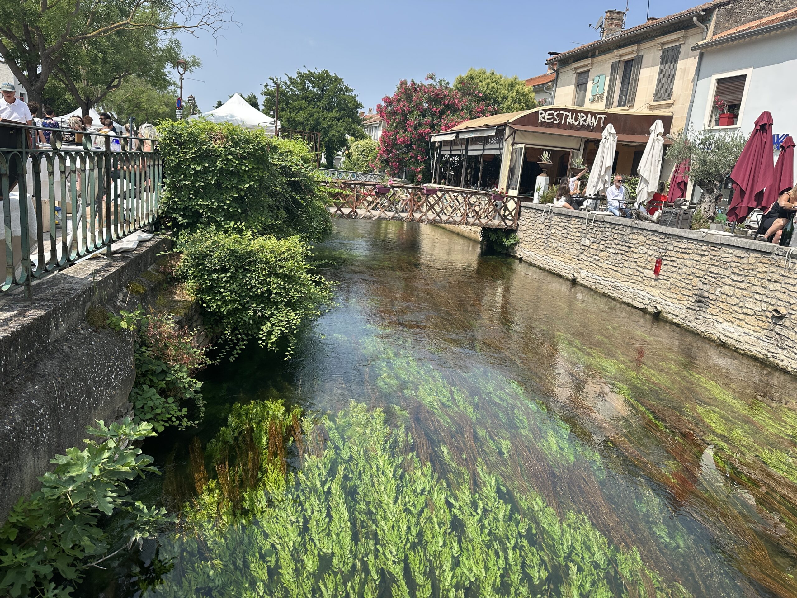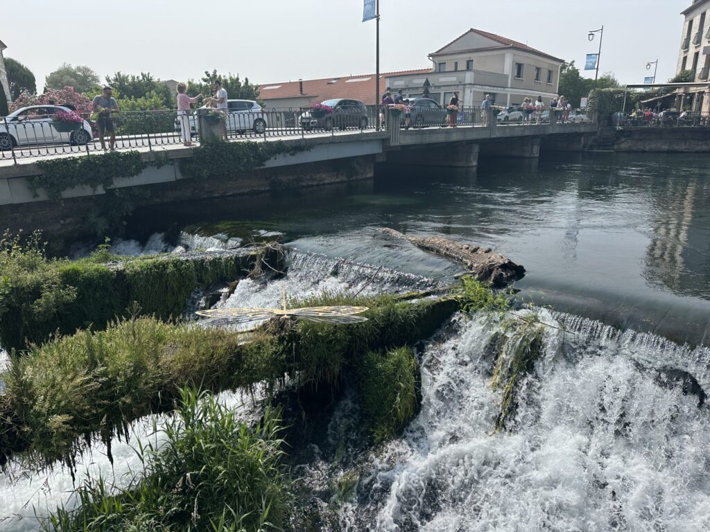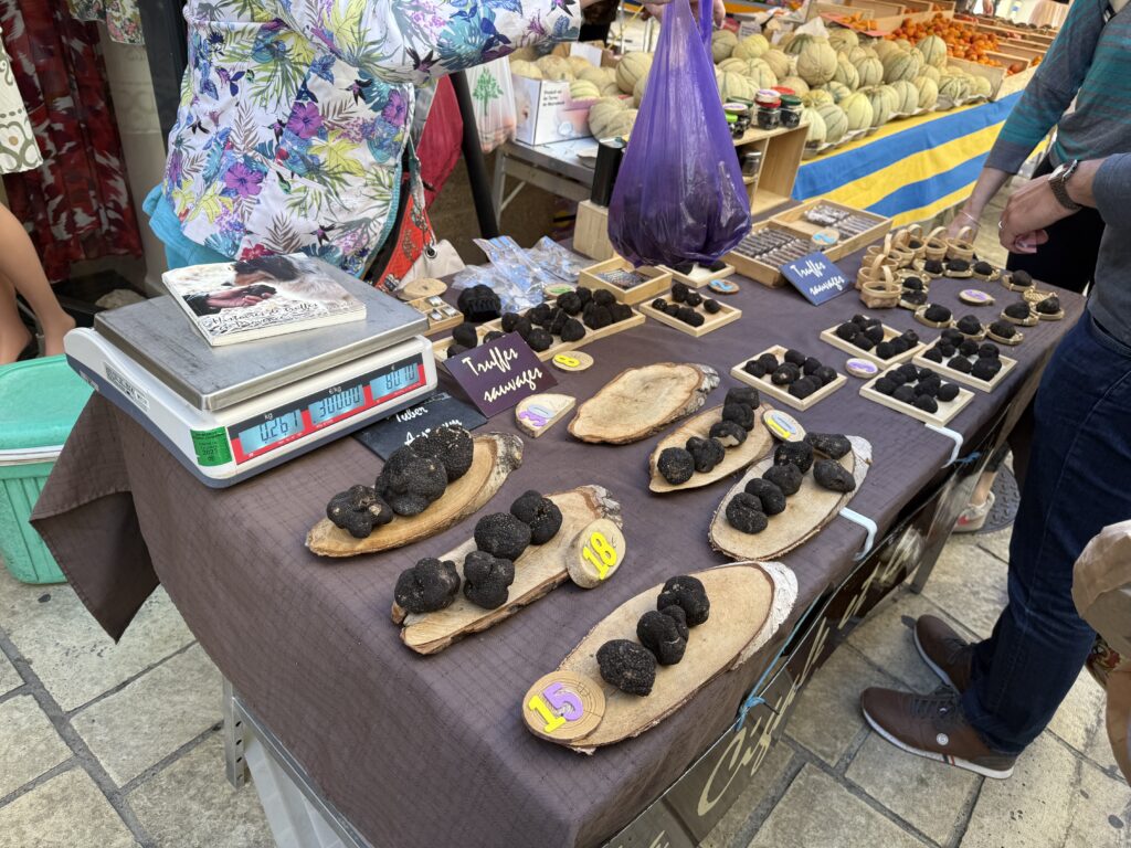 The next day in L’Isle-sur-la-Sorgue was market day, a ton of windy fun. Merch included edibles, wearables, and dining gear, all with a beautiful French twist. It was a very pretty day, but rather than further exhaust ourselves visiting civilizations eradicated by deplorables, we opted to have a quiet time by the hotel pool and then disassemble our edible panoply. We had a fabulous pistachio pate-en-croute from a prize-winning traiteur, cheeses evidently made in flights of fantasy from local institutions, and some palatable Languedoc wine.
