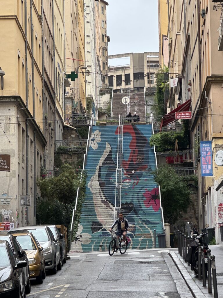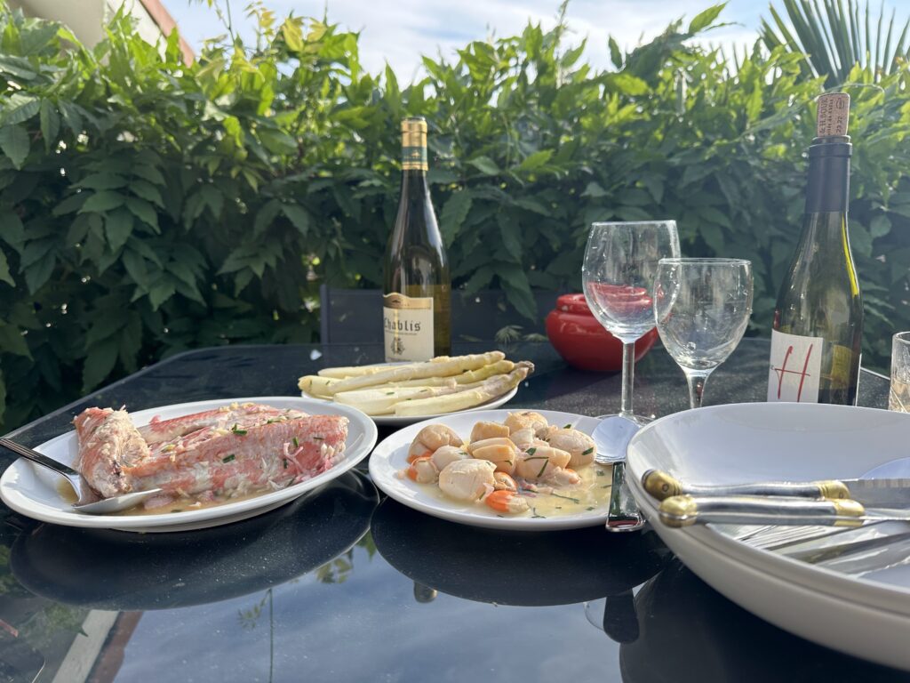 One historical layer is piled upon another in Lyon. Gallo-Roman ruins live cheek-by-jowl with Gothic churches and modern murals. Here are a few city scenes to amuse you including a view from our airbnb as well as the dinner of mullet and scallops with fat white asparagus Mikie made one night.