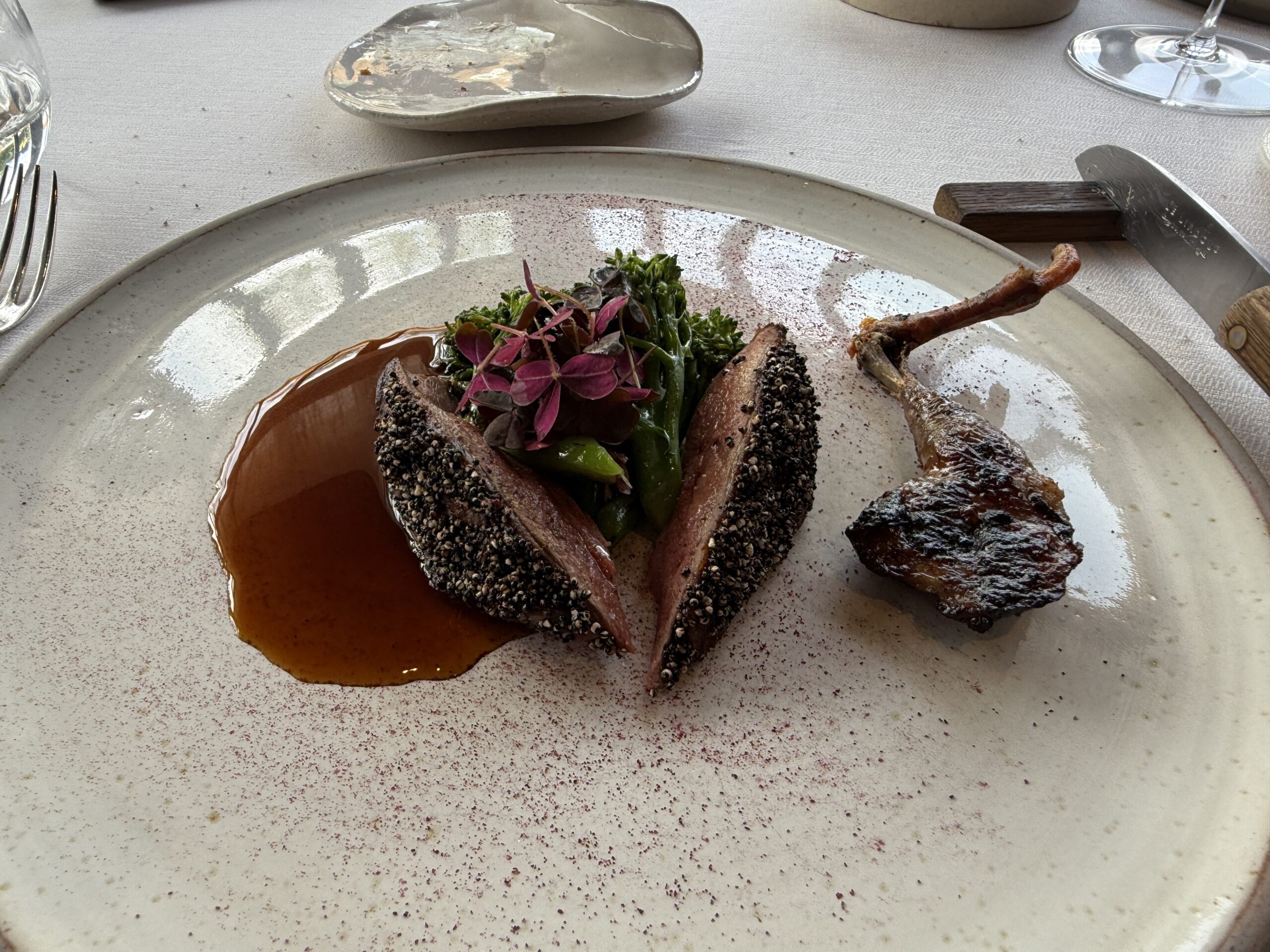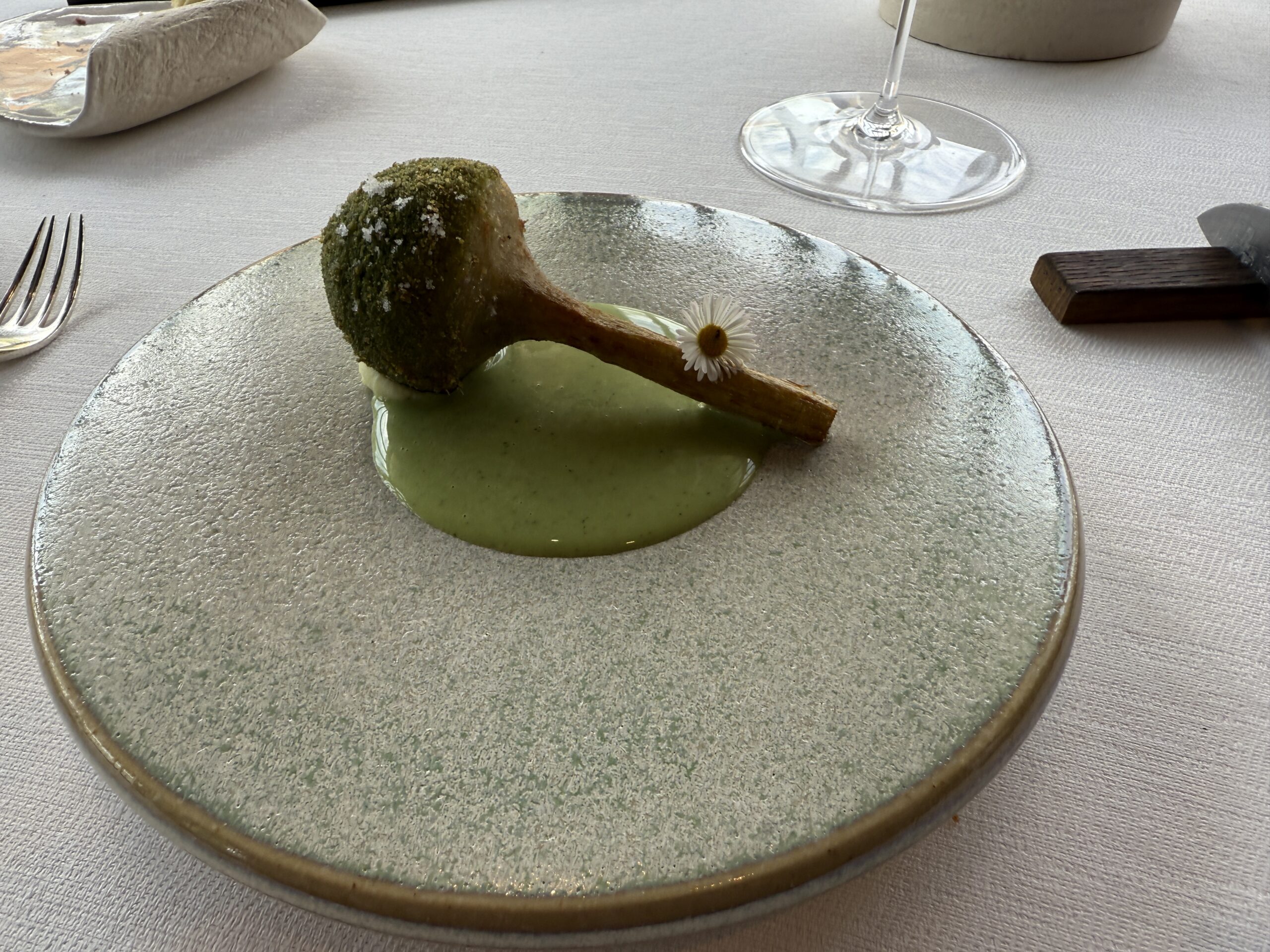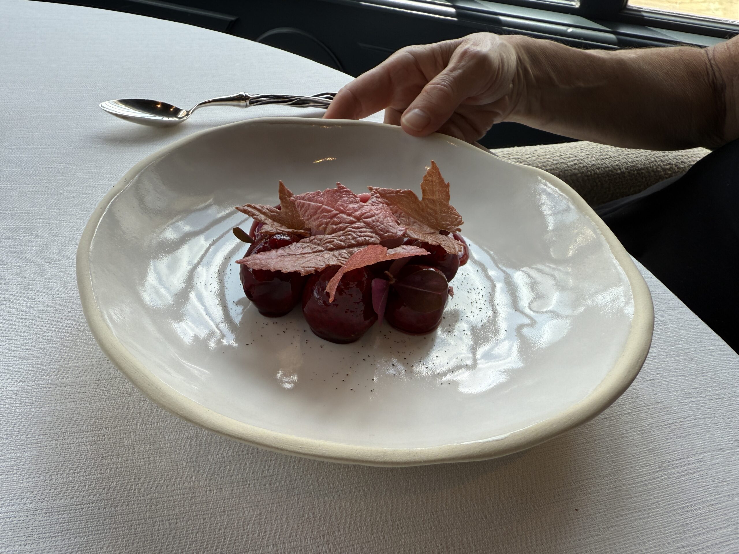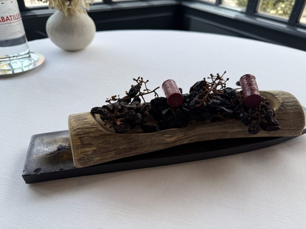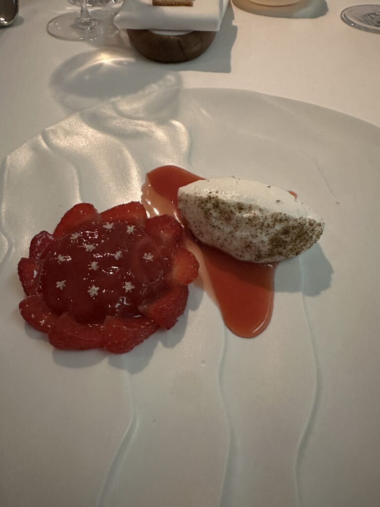 Mysterious appie #1Mysterious appie #2Looks like corks, right?ArtichokeMulletFish courseMeat course: squabStrawberriesnot a grape