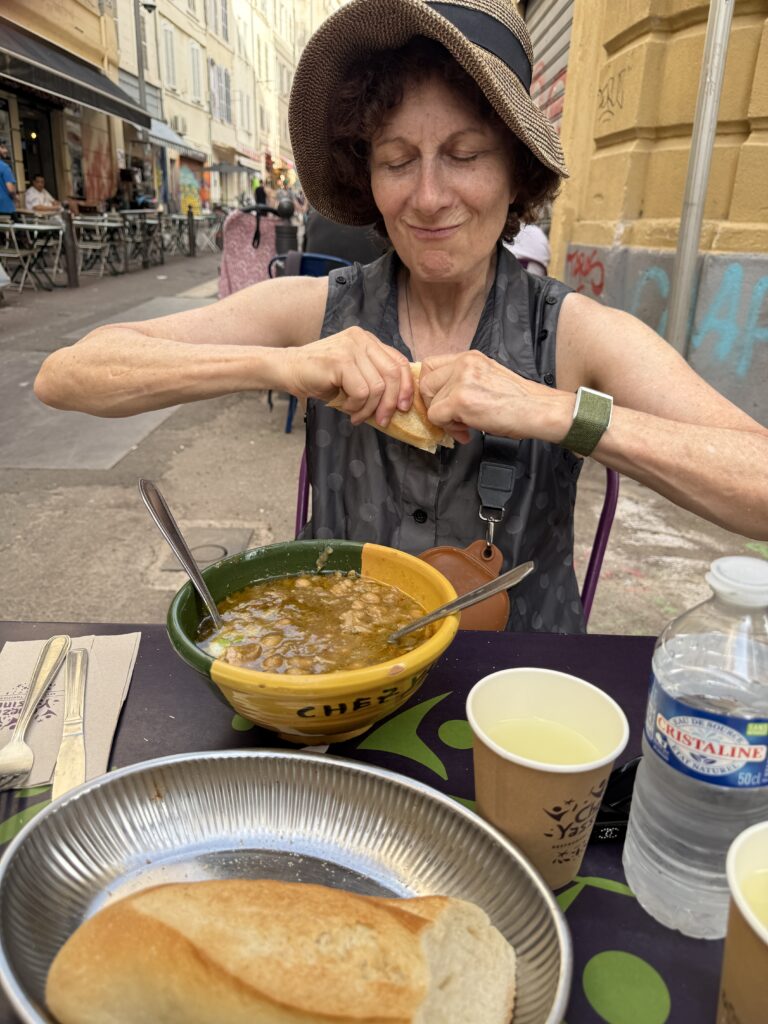 We took the train to Aix-en-Provence, a rich, manicured town with shops serving, e.g. truffles or pistachio marshallows, On our return to Marseille, to cleanse the palate, or perhaps restore its bacteria, we went for Tunisian food at Chez Yassine, where we had Leblebi with tuna, Kafteji with Merguez, and their homemade citronnade, a lemonade, all for 20 euros. I loved the spices even if they caused some pain.