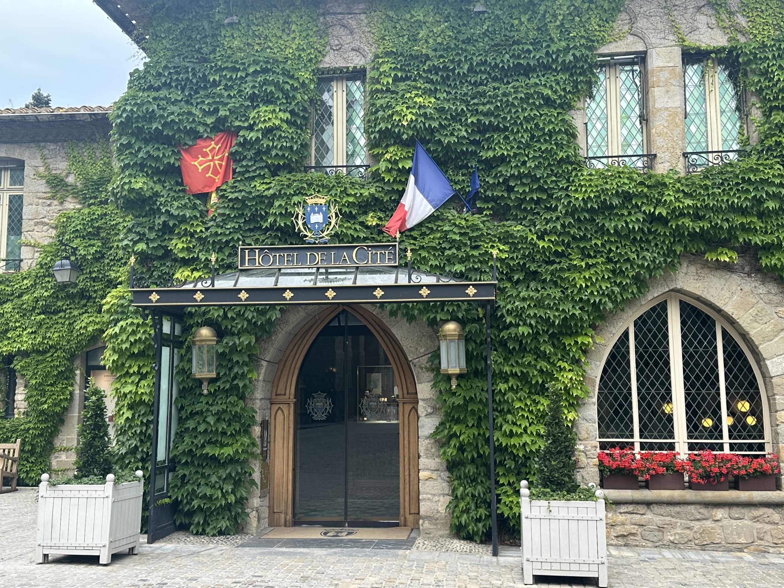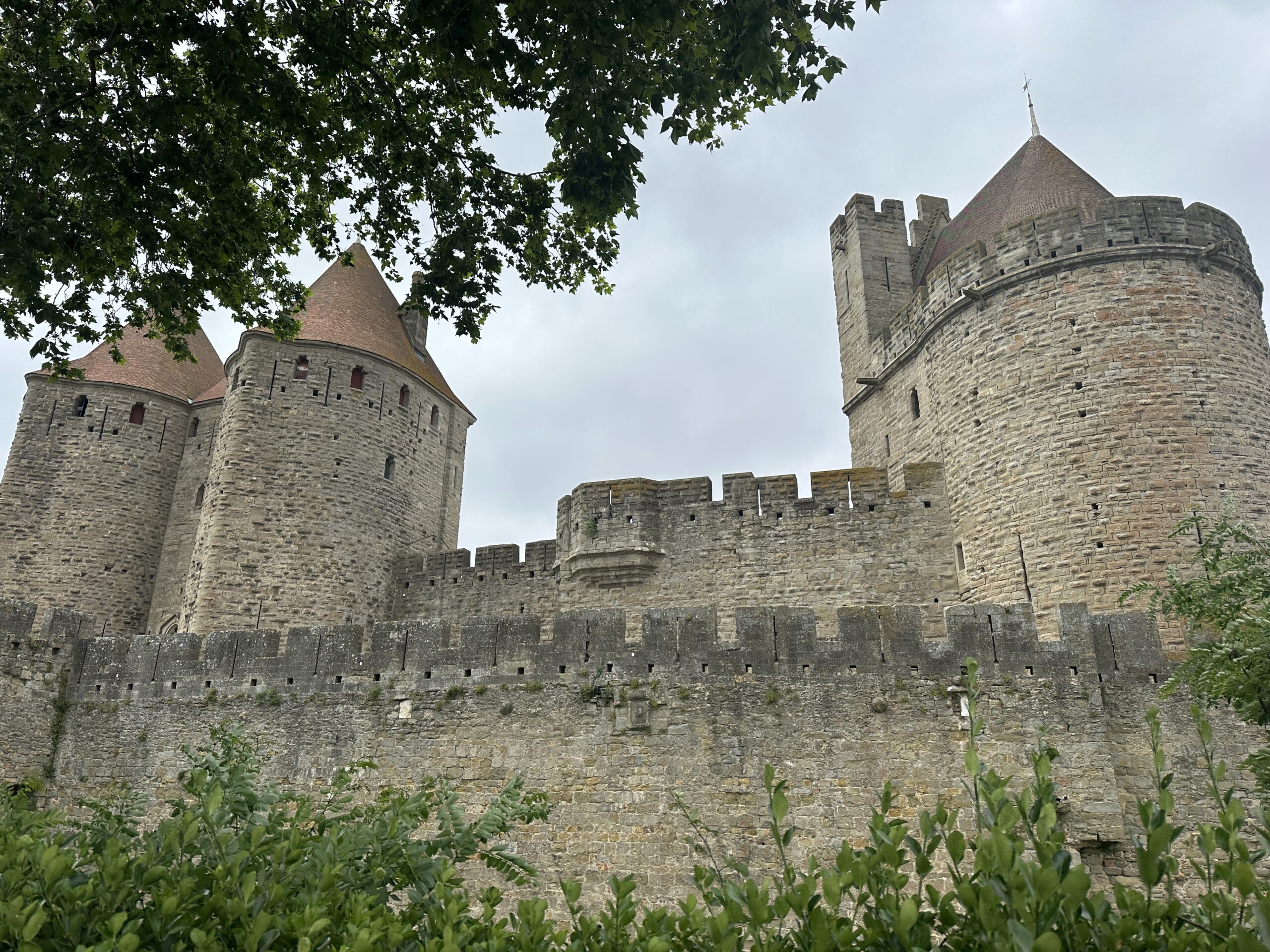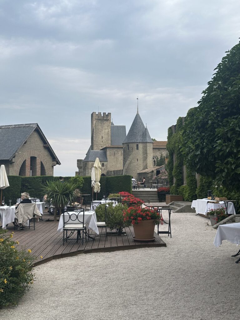 Here’s a 2000-year-old fortress town that was occupied in turn by Romans, Visigoths, Saracens, Crusaders, and tourists. In the 1800s, the architect who restored Notre-Dame in Paris was given the job of restoring the city, and the result is impressive. From our hotel garden, we look across the restaurant at the inner castle in the distance. We are living in the historic site!