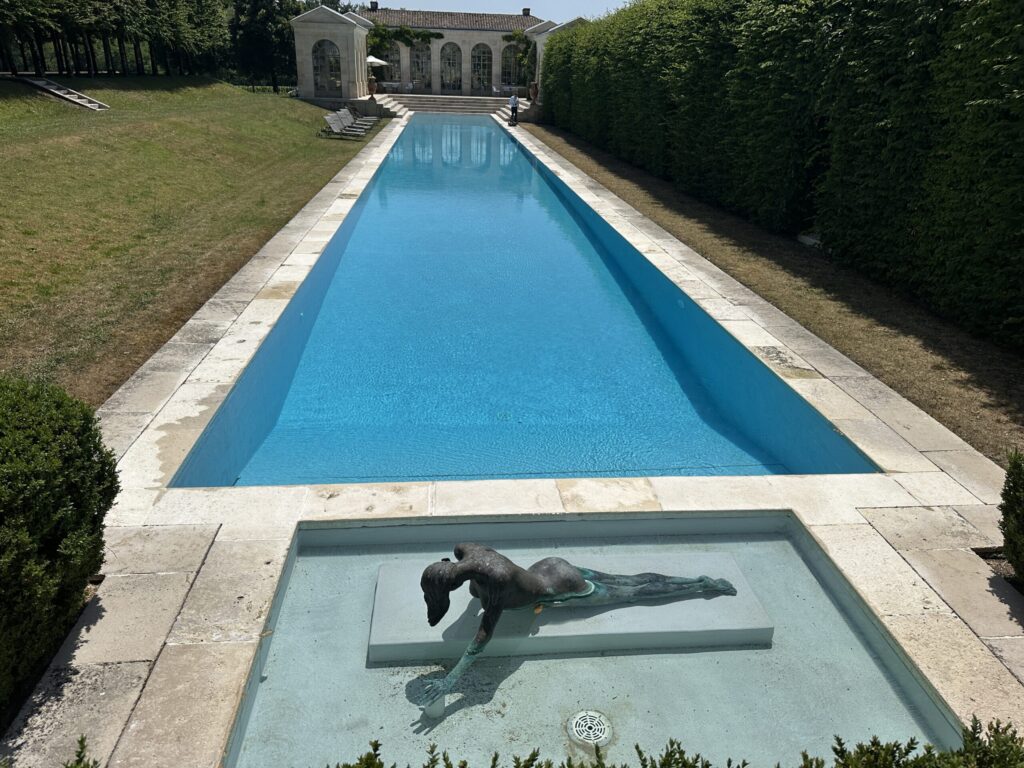 On Friday, we had two wine tastings. Chateau Lynch-Bages is a new facility with capacity to produce 1,500,000 bottles per year. It’s very industrial in scale. Chateau du Tertre is sort of the opposite, and would be homey and family oriented but the succession of owners were fabulously wealthy, and have decorated the place with extravagant paintings and sculptures, a 50-meter swimming pool, and meanwhile producing 200,000 bottles per year.